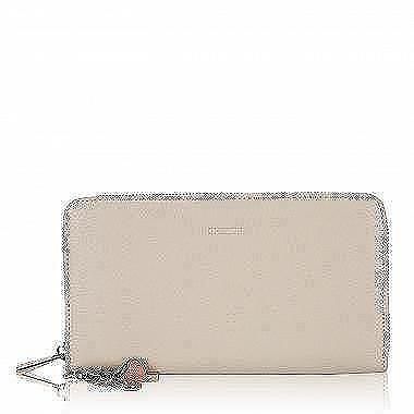 Вместительное портмоне с классическим дизайном прекрасно подойдет в качестве элемента повседневного гардероба. Модель из кремовой натуральной кожи рассчитана на полную купюру и закрывается с помощью застежки-молнии. В портмоне три отделения для банкнот, три открытых кармана, карман на молнии для мелочи и двенадцать слотов для пластиковых карточек. В комплекте идут подарочная коробочка и съемный фирменный брелок.